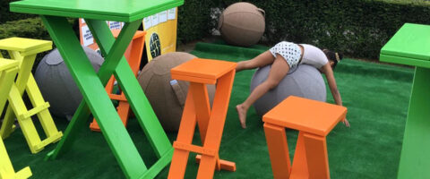 Twee sets van bartafel en barkrukken. Deze zijn onderdeel van ‘Ik ben aan de bal-live’. Dit pakket kun je bij SBCM lenen om binnen je eigen organisatie een kick-off van jullie campagne te organiseren. De bartafel en krukken kunnen speels worden neergezet op het kunstgras.
