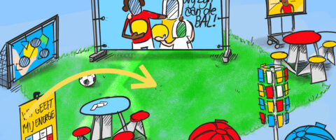 Het kunstgrasveld vormt de basis voor ‘Ik ben aan de bal-Live’. Dit pakket kun je bij SBCM lenen om binnen je eigen organisatie een kick-off van jullie campagne te organiseren. Op en rondom het grasveld kun je de andere fysieke materialen uit het pakket opstellen. Zo ontstaat er samenhang en loop je er als deelnemer fysiek in.